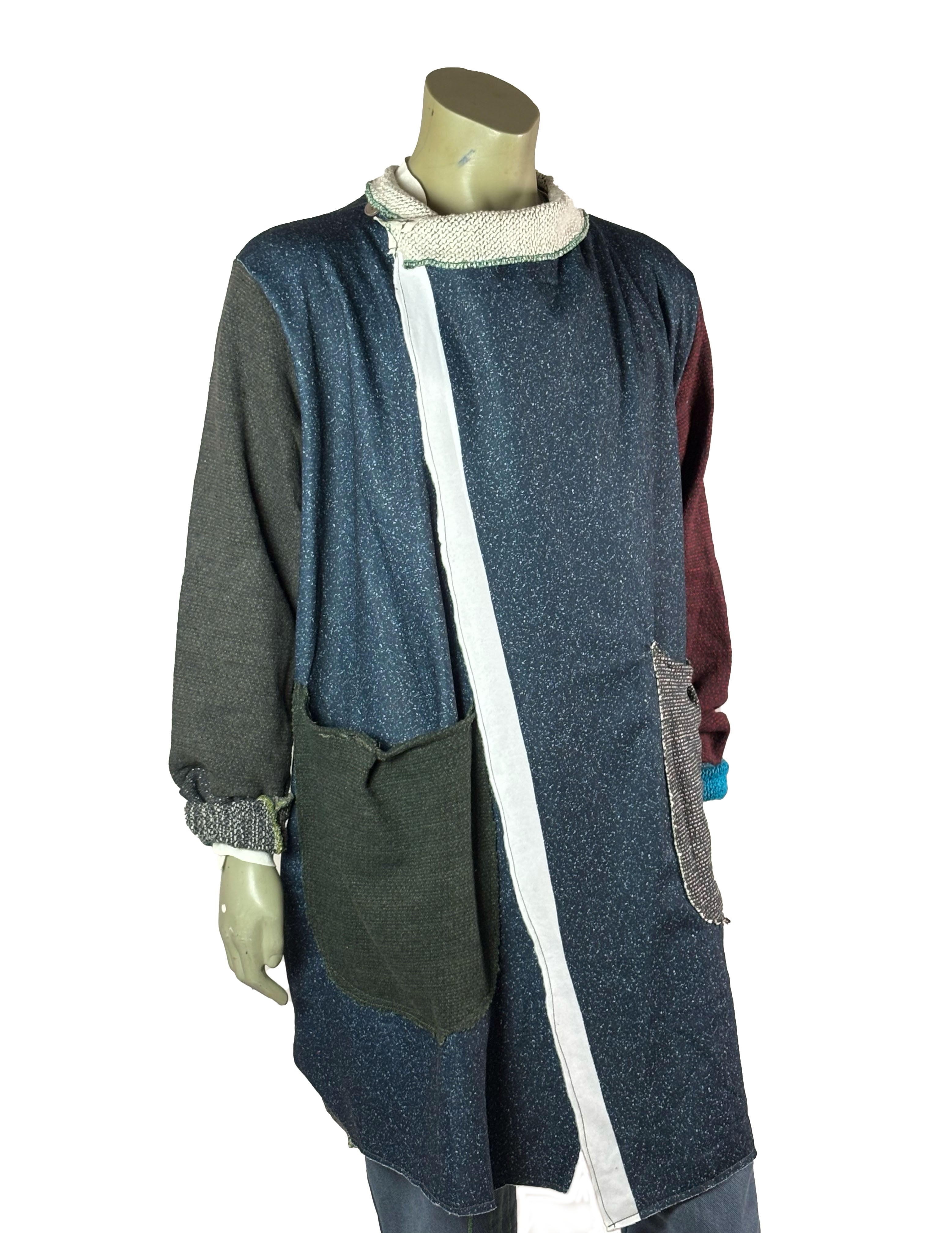 The layered compositions, visible seams and raw edges reflect the making process and highlight the individuality of each cape. Designed to be worn loosely, the silhouettes fall naturally around the body, allowing freedom of movement and an effortless, sculptural drape. Despite their differences, all ten pieces share a common attitude: relaxed, expressive and quietly architectural.
