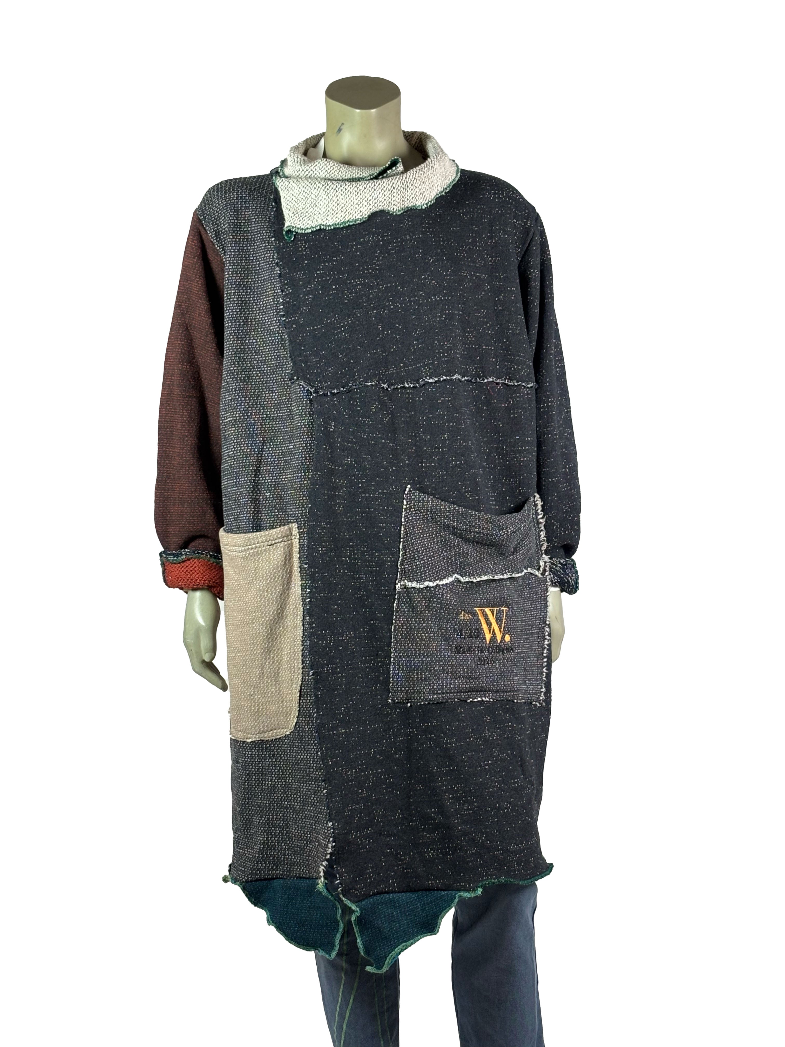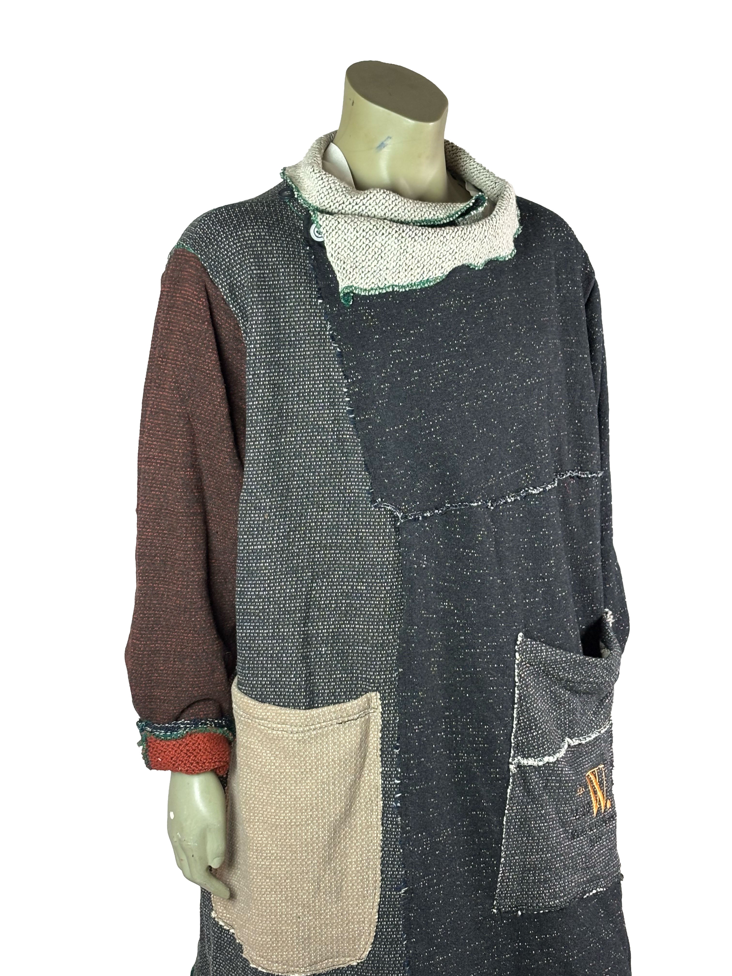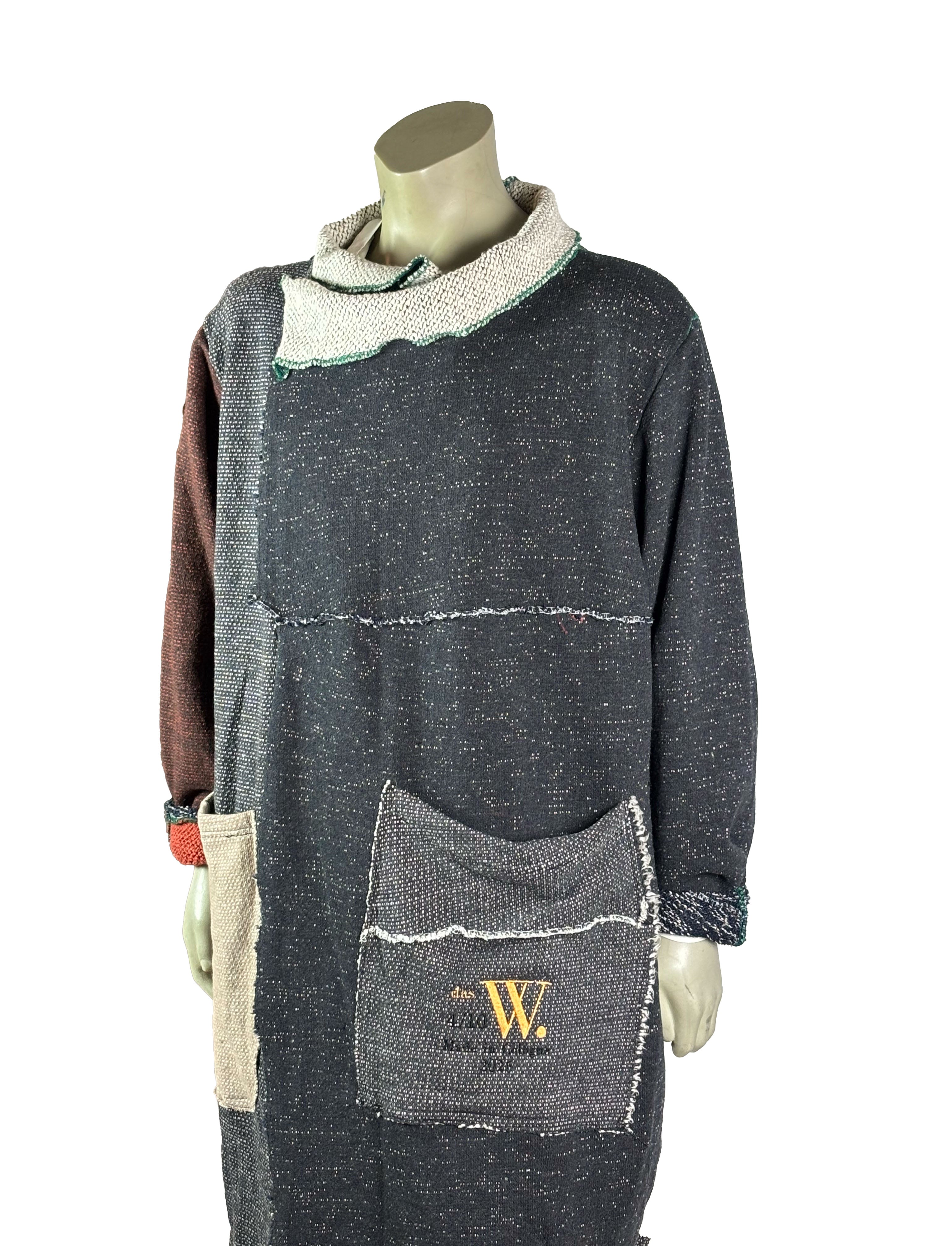 This handcrafted unisex cape from Cologne, Germany is part of a limited 1-of-10 series. Each piece is created through a carefully assembled mix of different fabrics, brought together in a handcrafted process that emphasizes material contrast and construction. Variations in texture, weight and surface are intentionally preserved, resulting in a one-of-a-kind garment with a sculptural, oversized silhouette and a cohesive visual language across the collection.