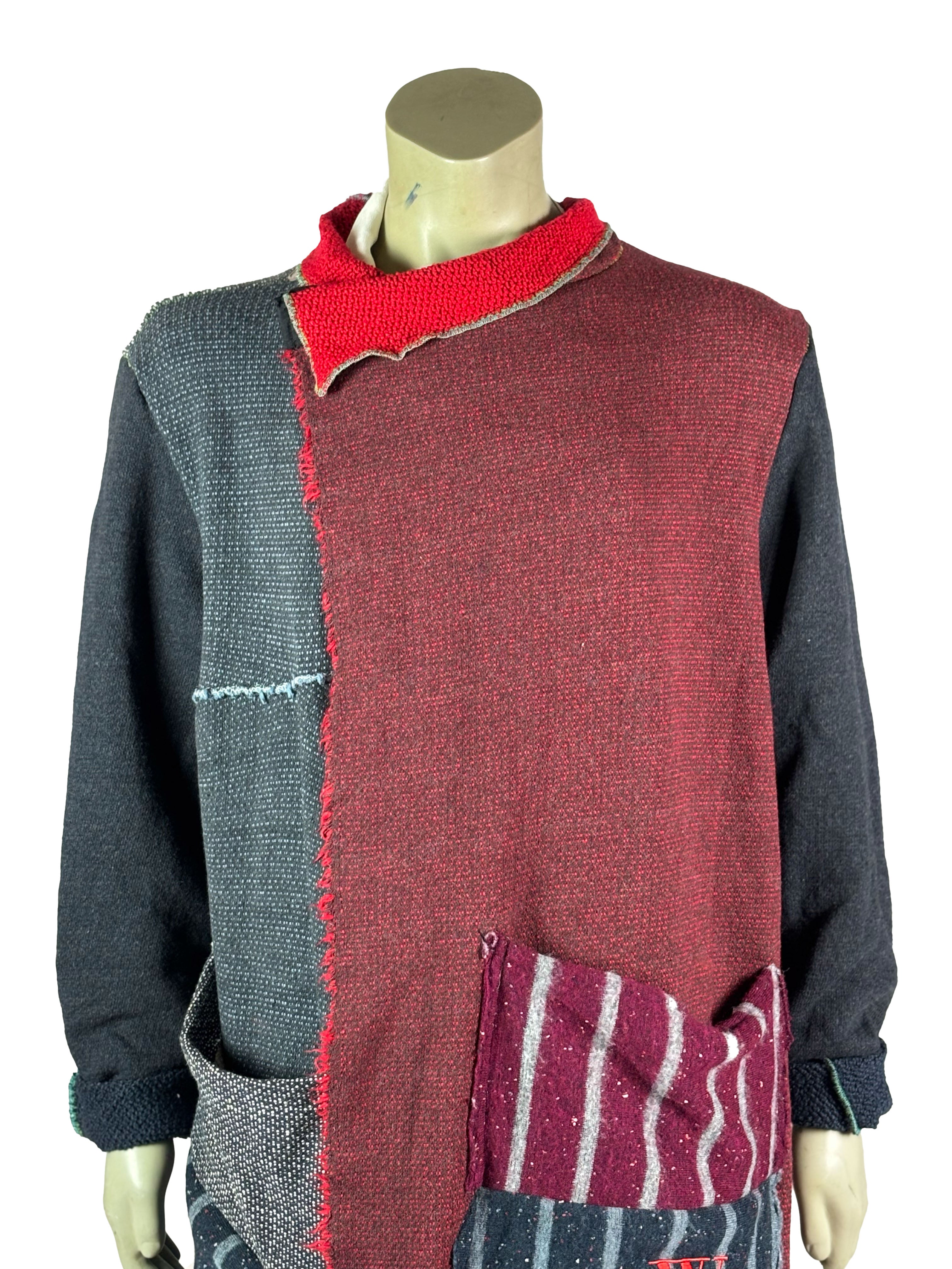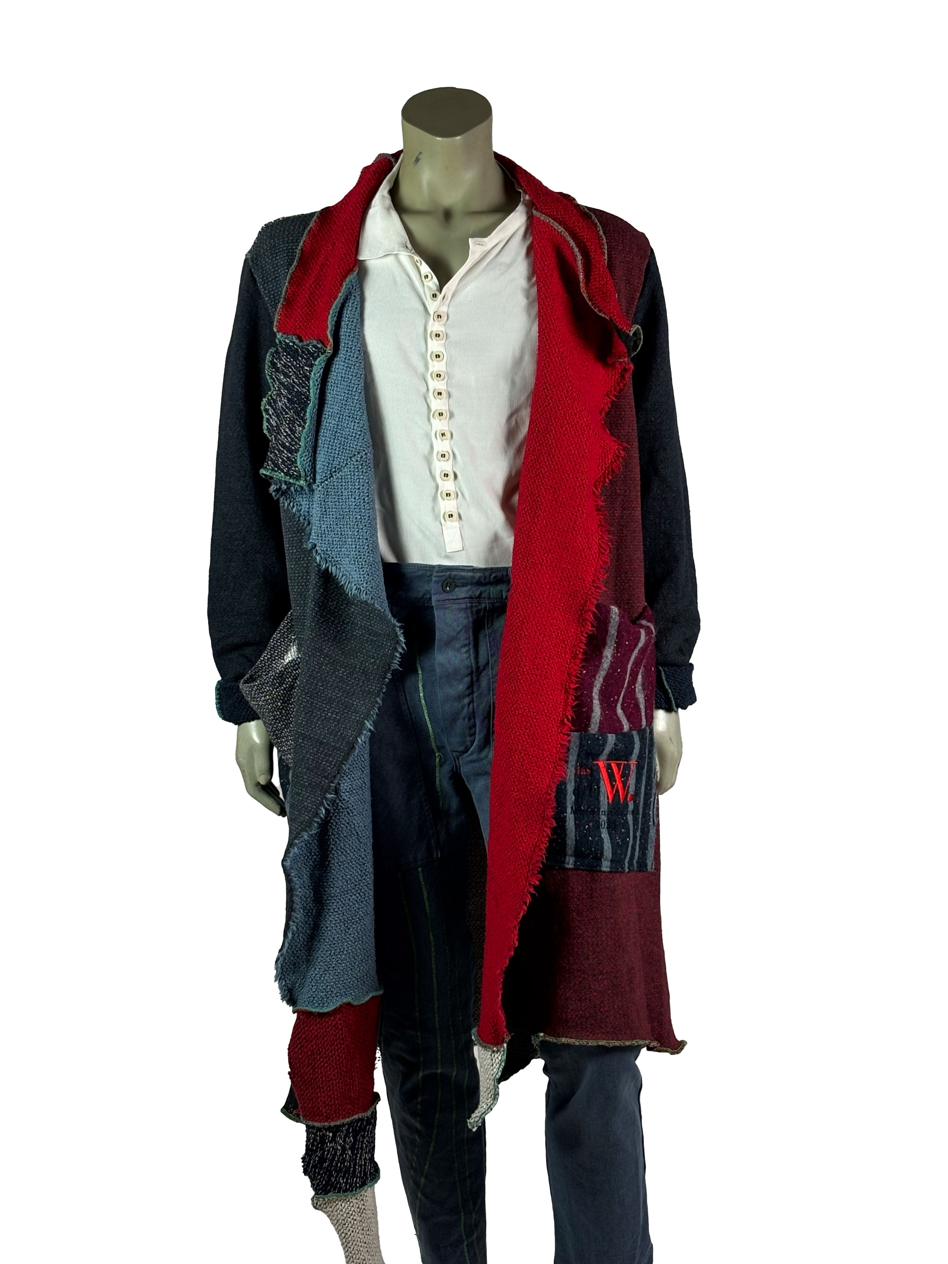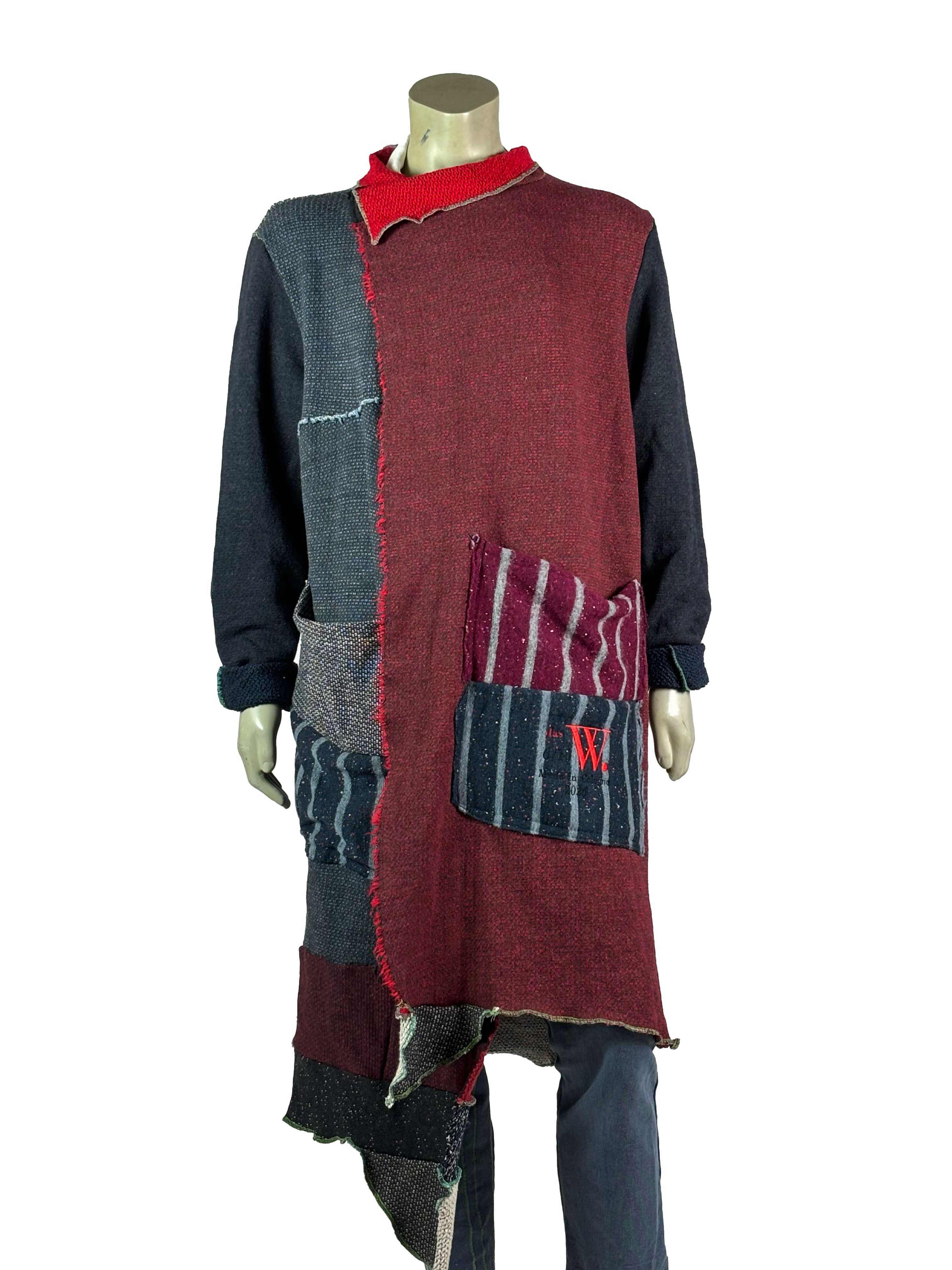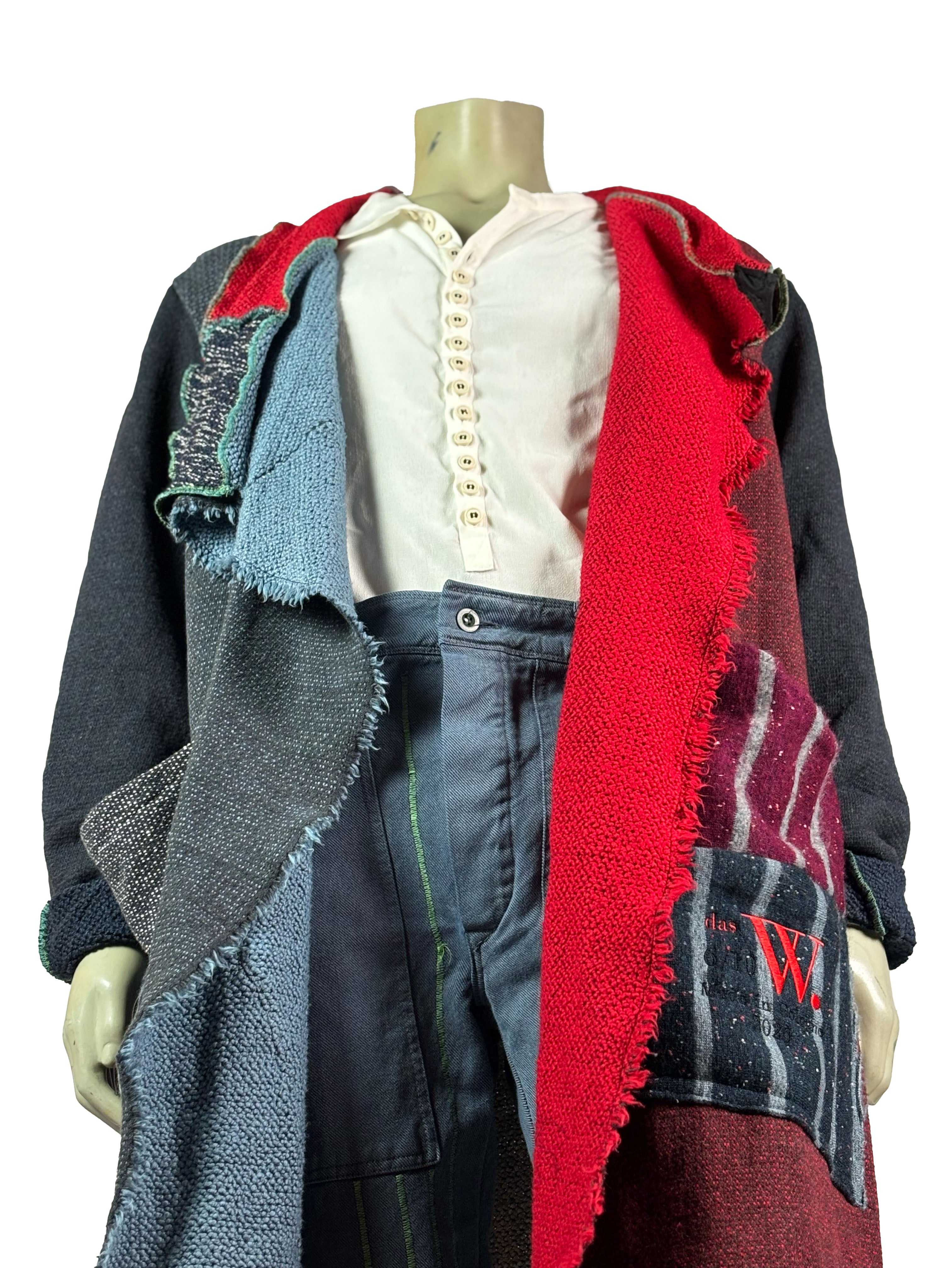 This handcrafted unisex cape from Cologne, Germany is part of a limited 1-of-10 series. Each piece is created through a carefully assembled mix of different fabrics, brought together in a handcrafted process that emphasizes material contrast and construction. Variations in texture, weight and surface are intentionally preserved, resulting in a one-of-a-kind garment with a sculptural, oversized silhouette and a cohesive visual language across the collection.
