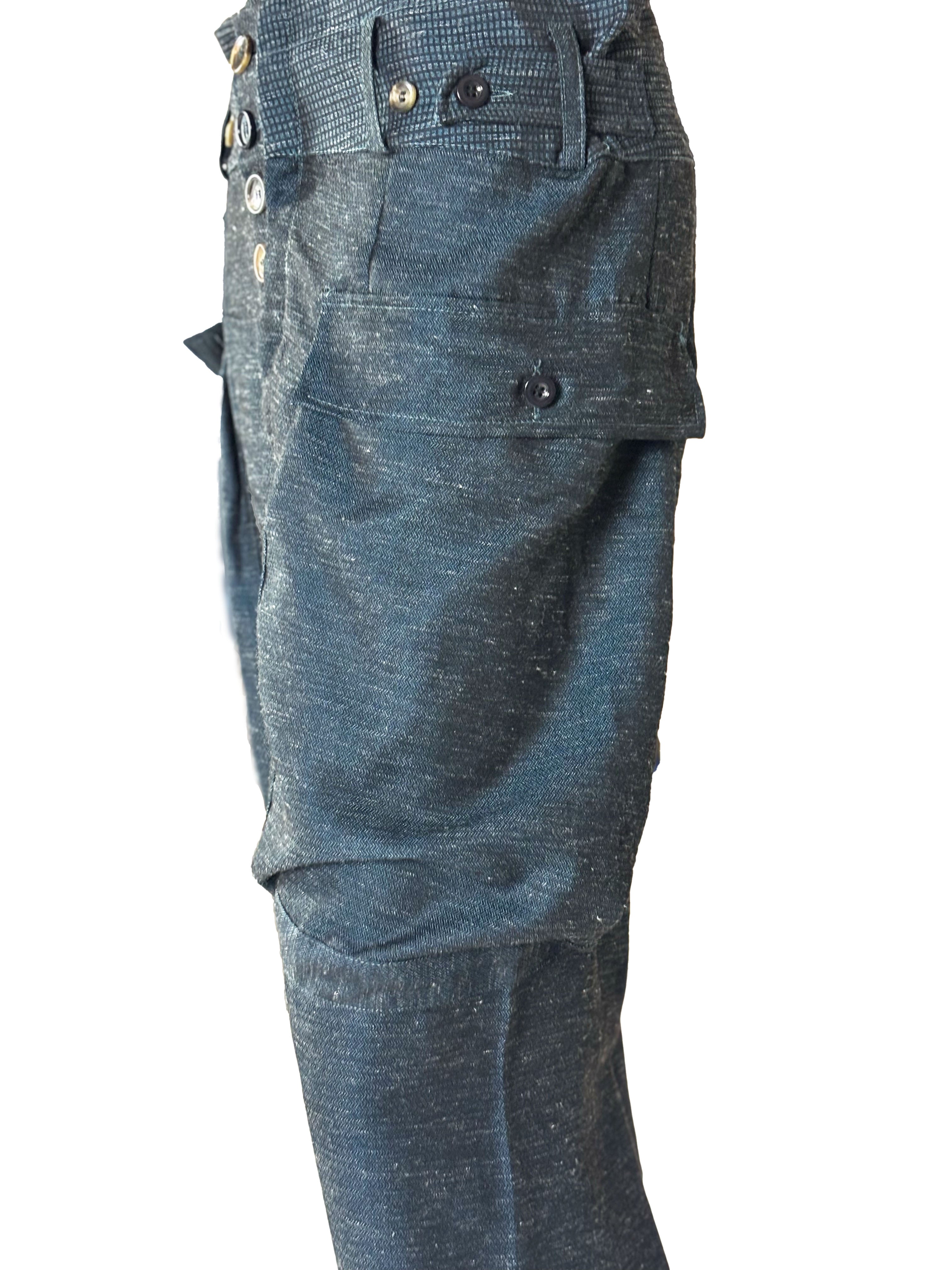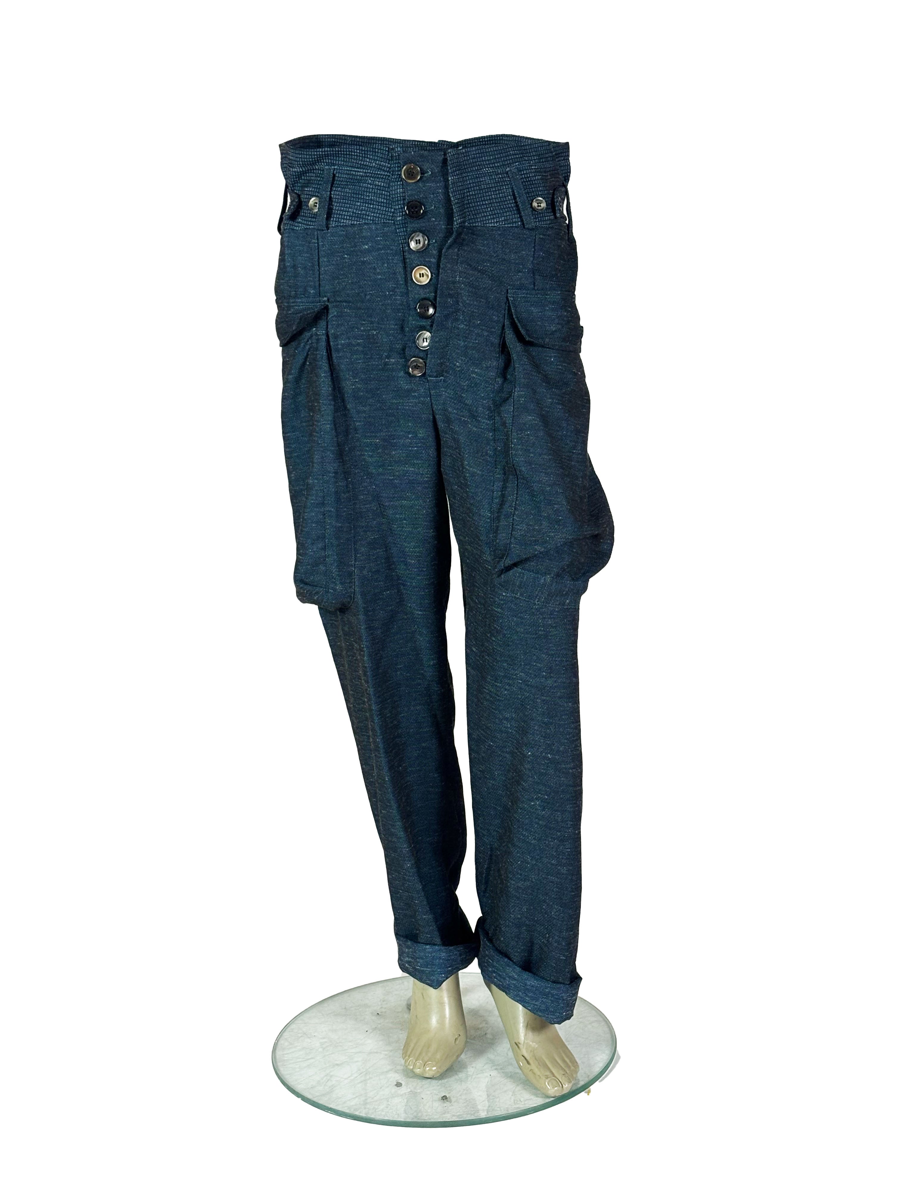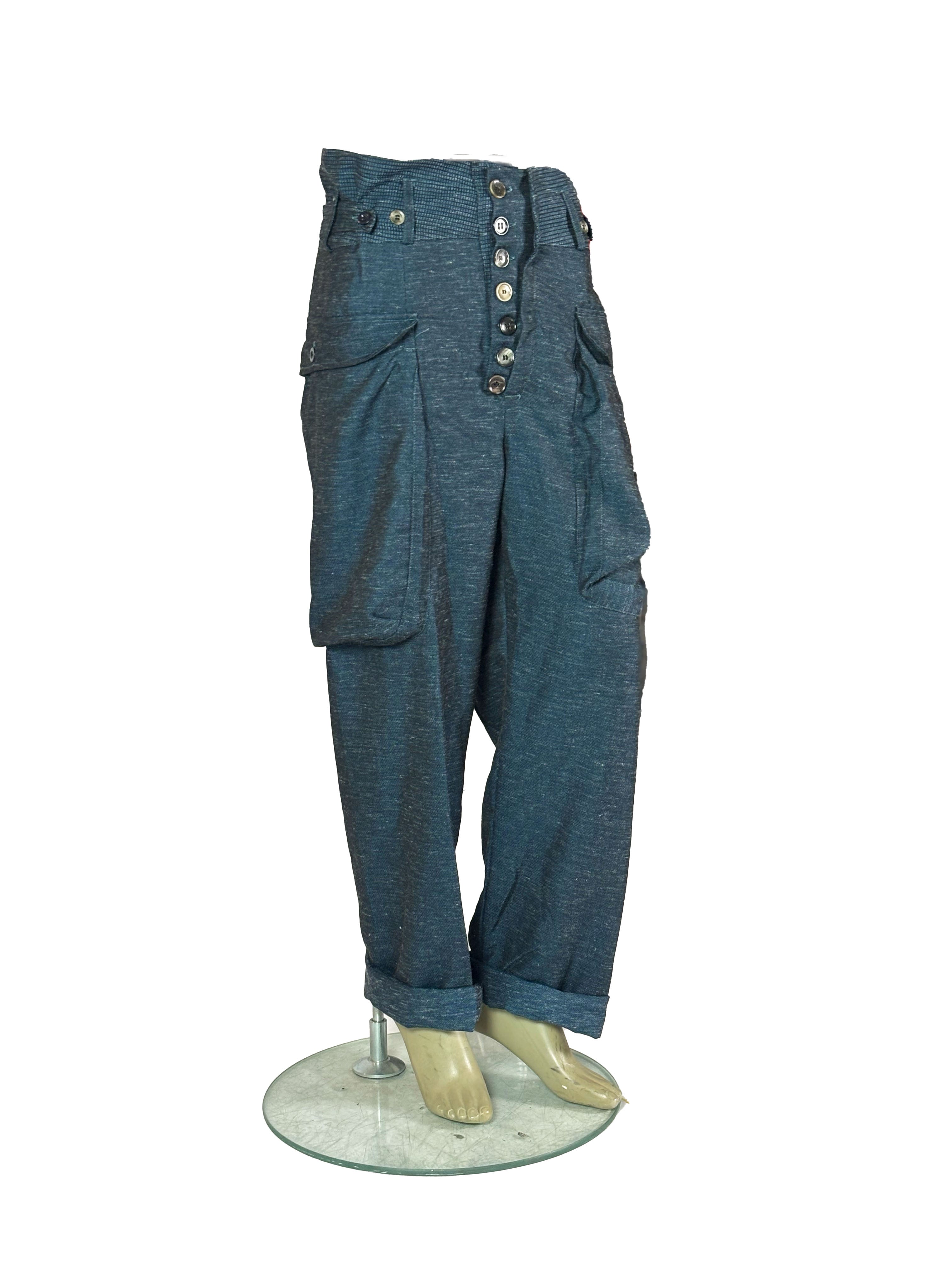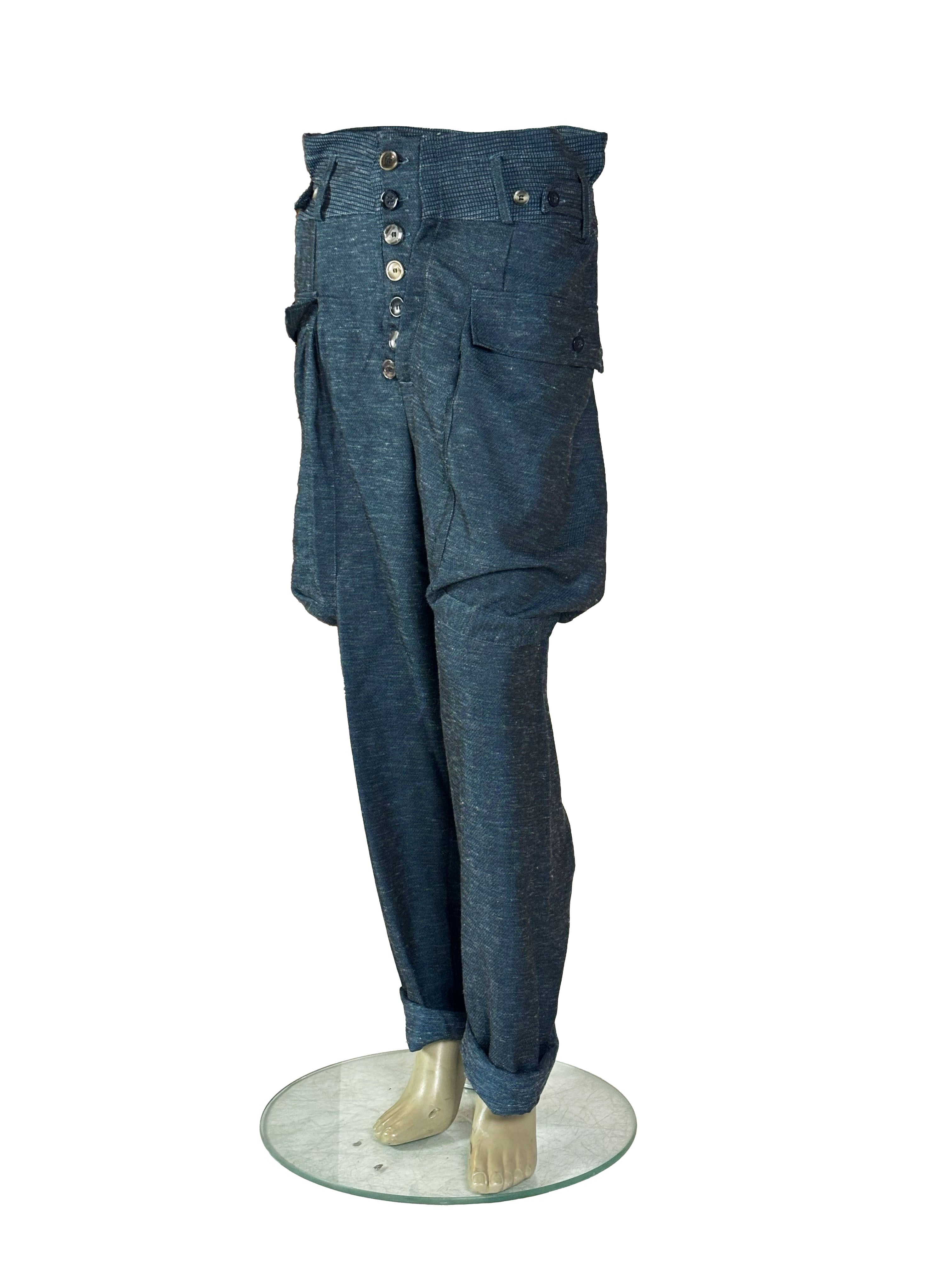 The silhouette is defined by a high-rise waist that sits above the hips, offering a secure and comfortable fit. The waist is adjustable, allowing the trousers to be worn more fitted or relaxed depending on preference. Extra-long legs are an intentional design feature — made to be worn cuffed, folded or stacked, giving the trousers a flexible and personal styling option.