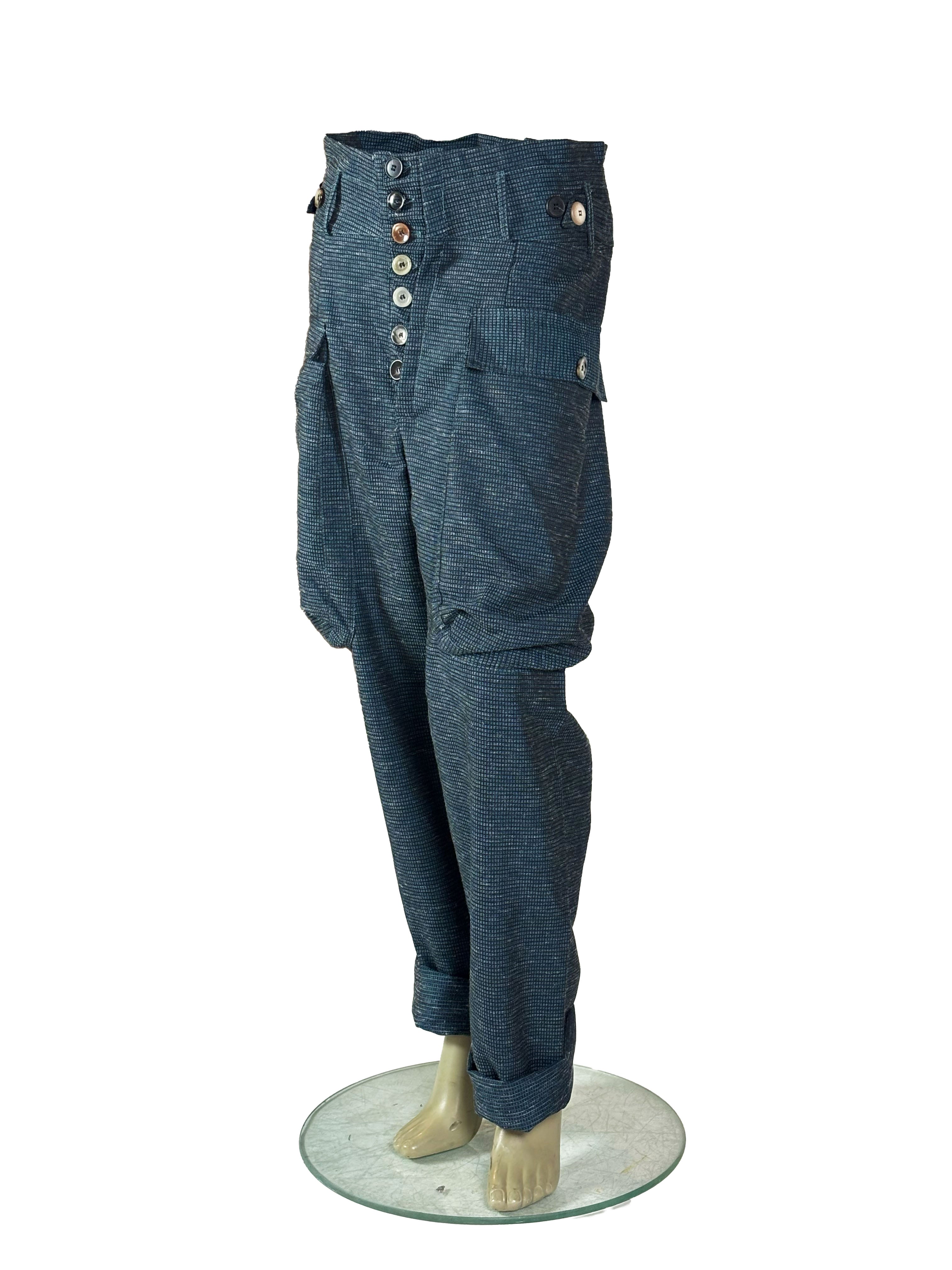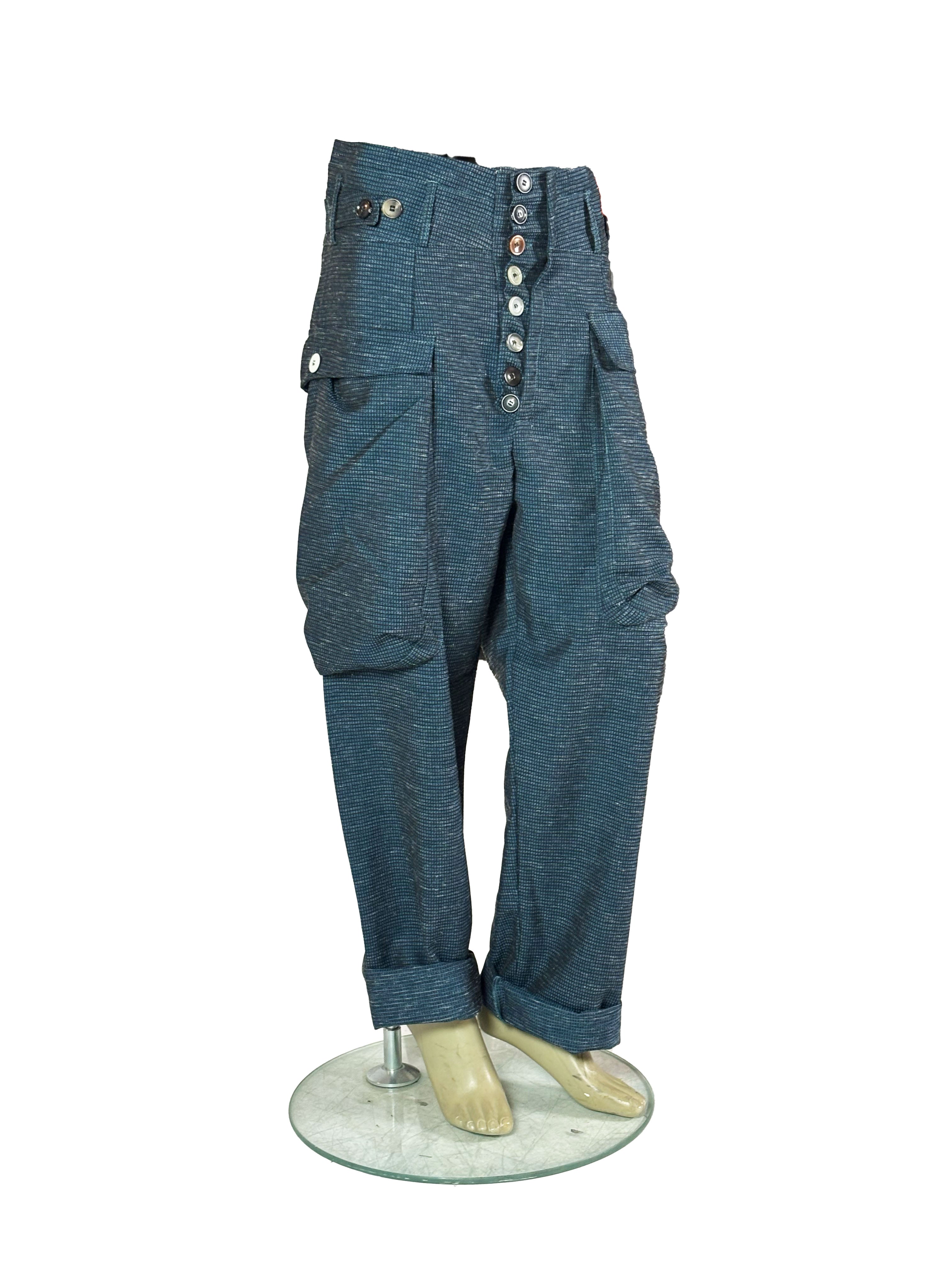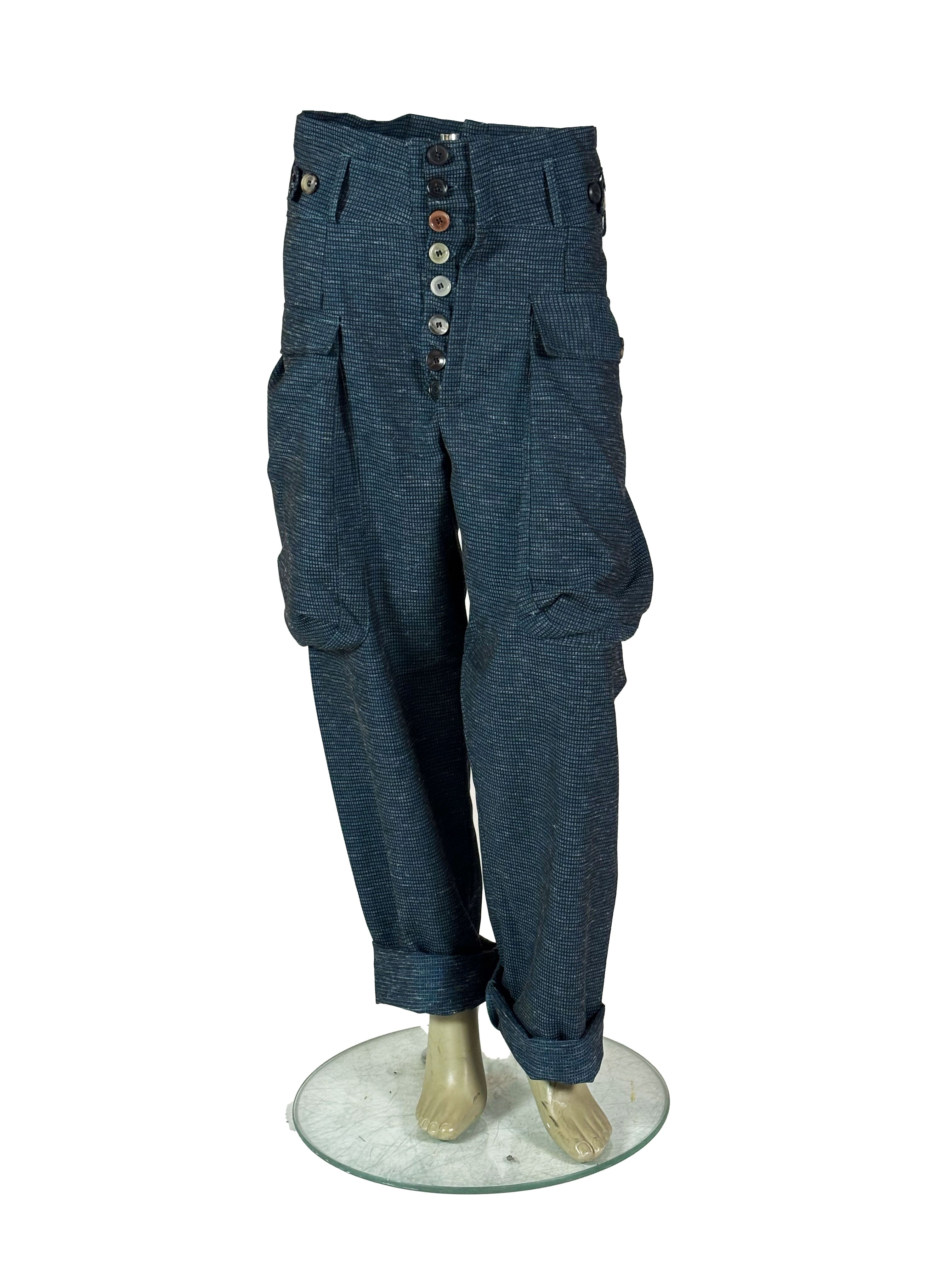 The silhouette is defined by a high-rise waist that sits above the hips, offering a secure and comfortable fit. The waist is adjustable, allowing the trousers to be worn more fitted or relaxed depending on preference. Extra-long legs are an intentional design feature — made to be worn cuffed, folded or stacked, giving the trousers a flexible and personal styling option.