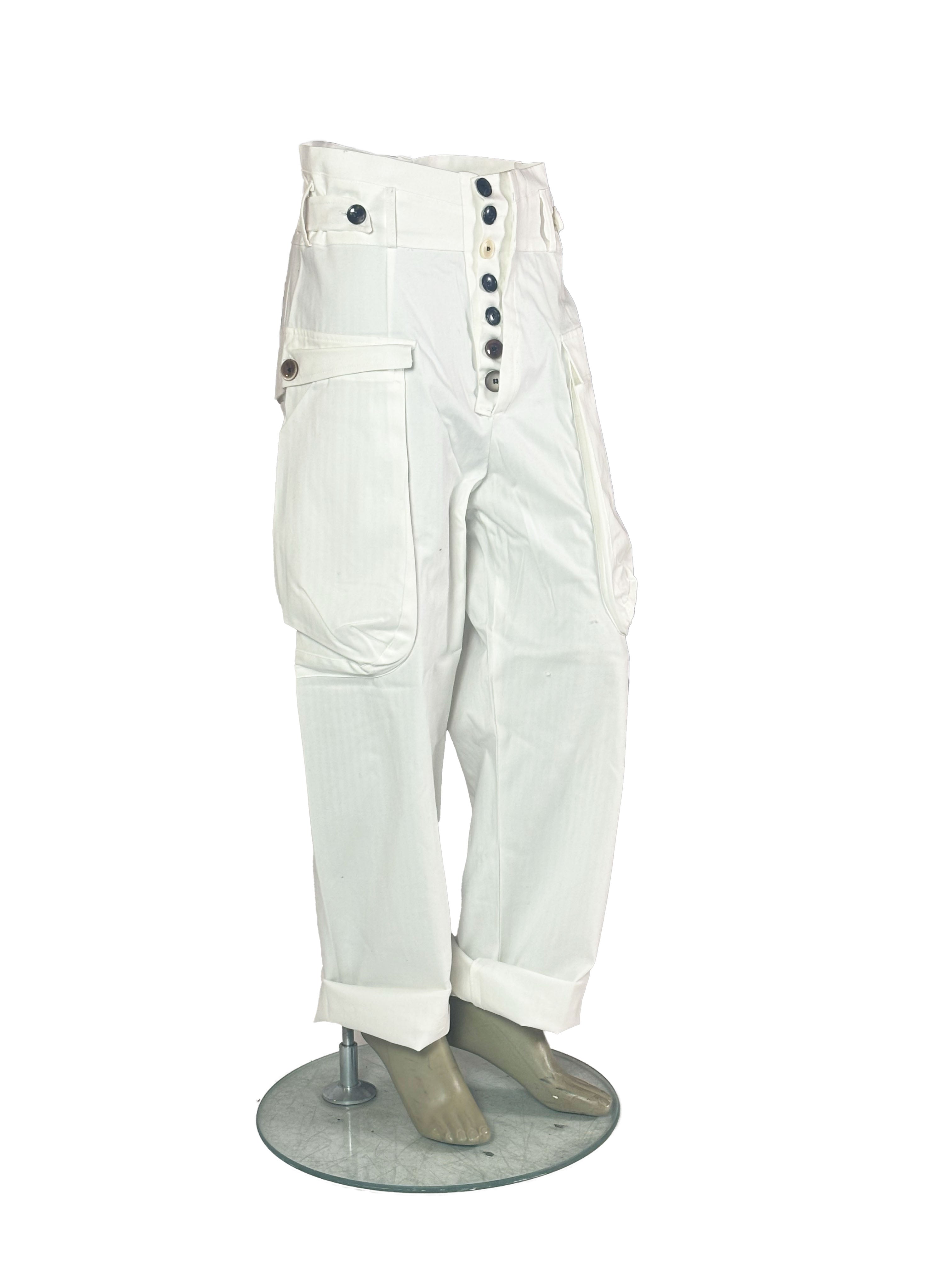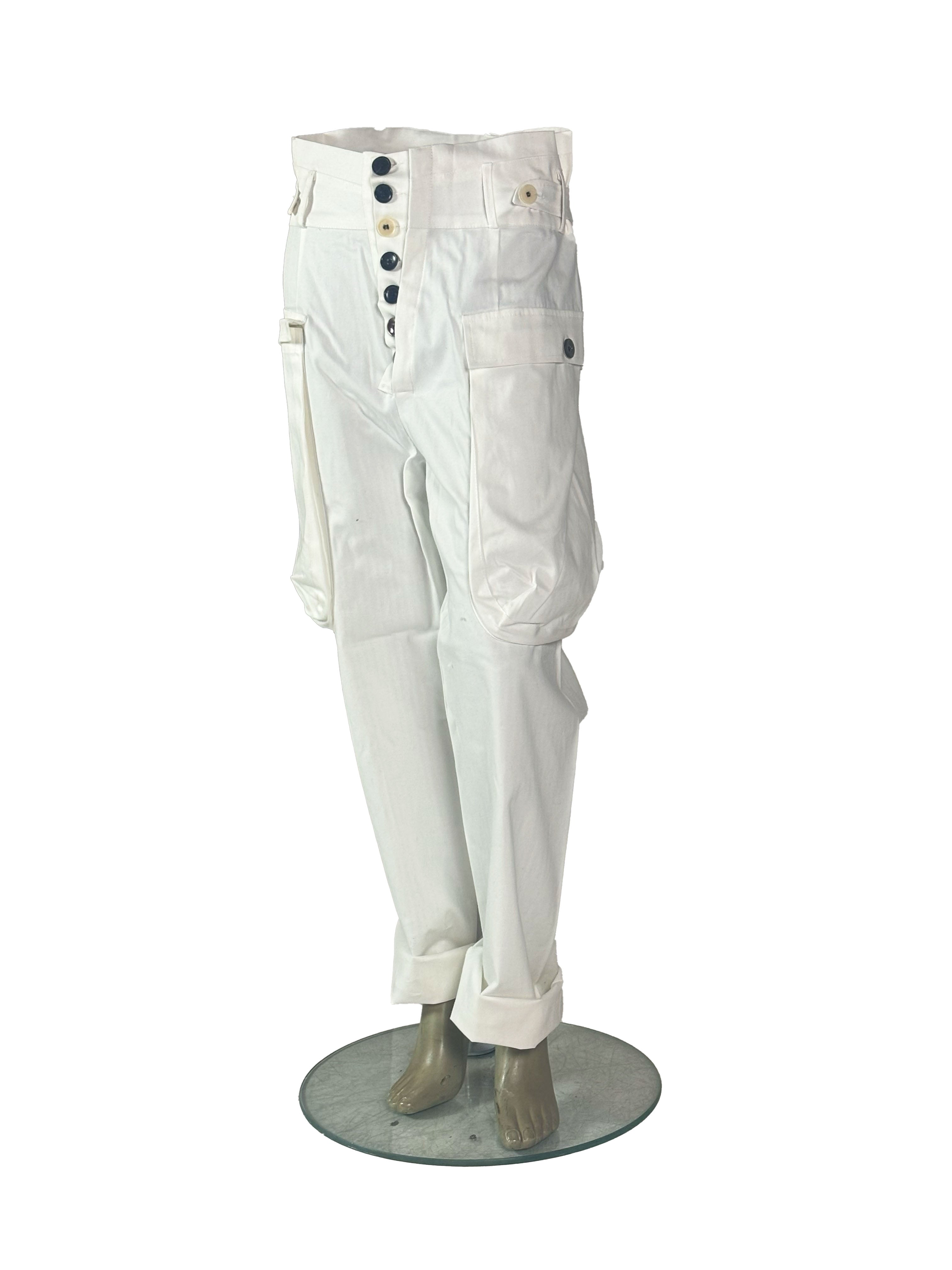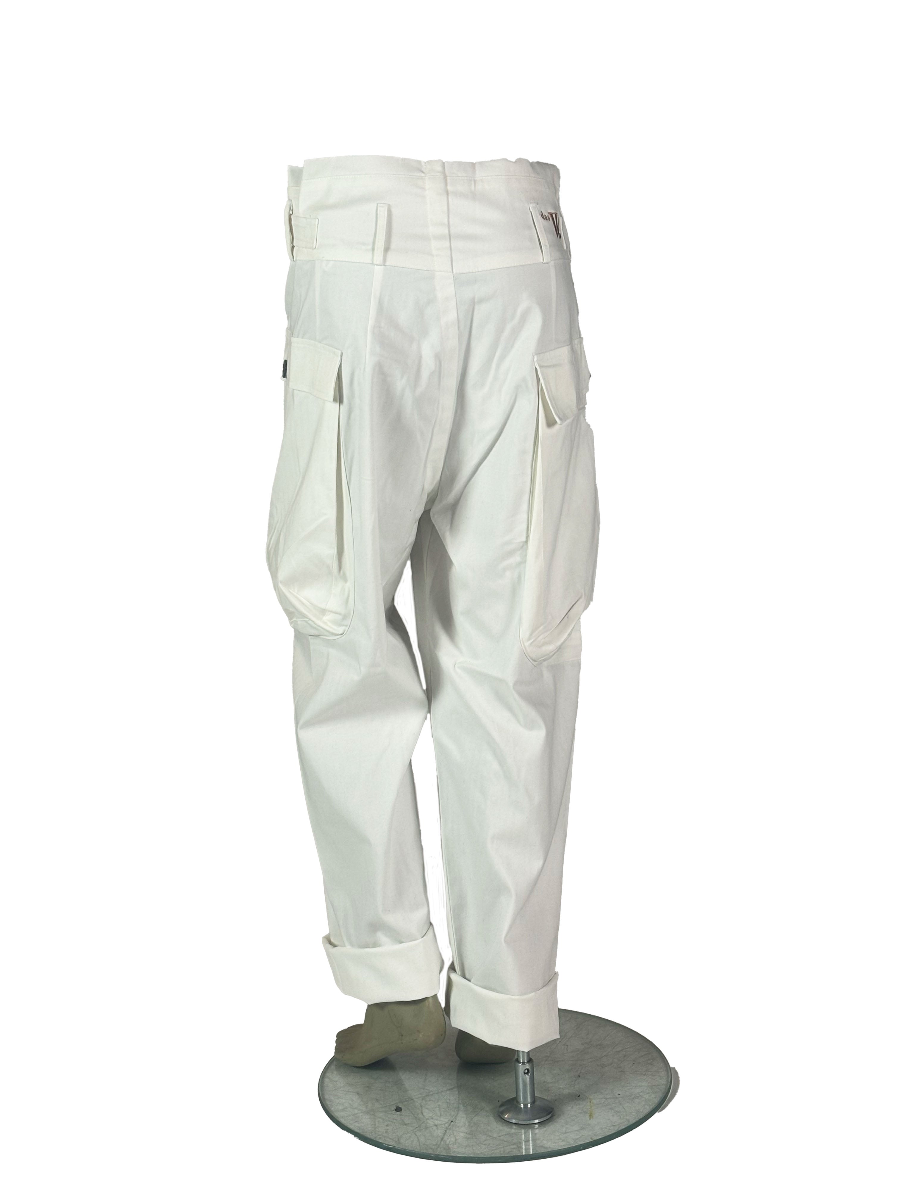In this white version, the trousers take on a clean and light presence, emphasizing the silhouette with a minimal and almost architectural clarity.