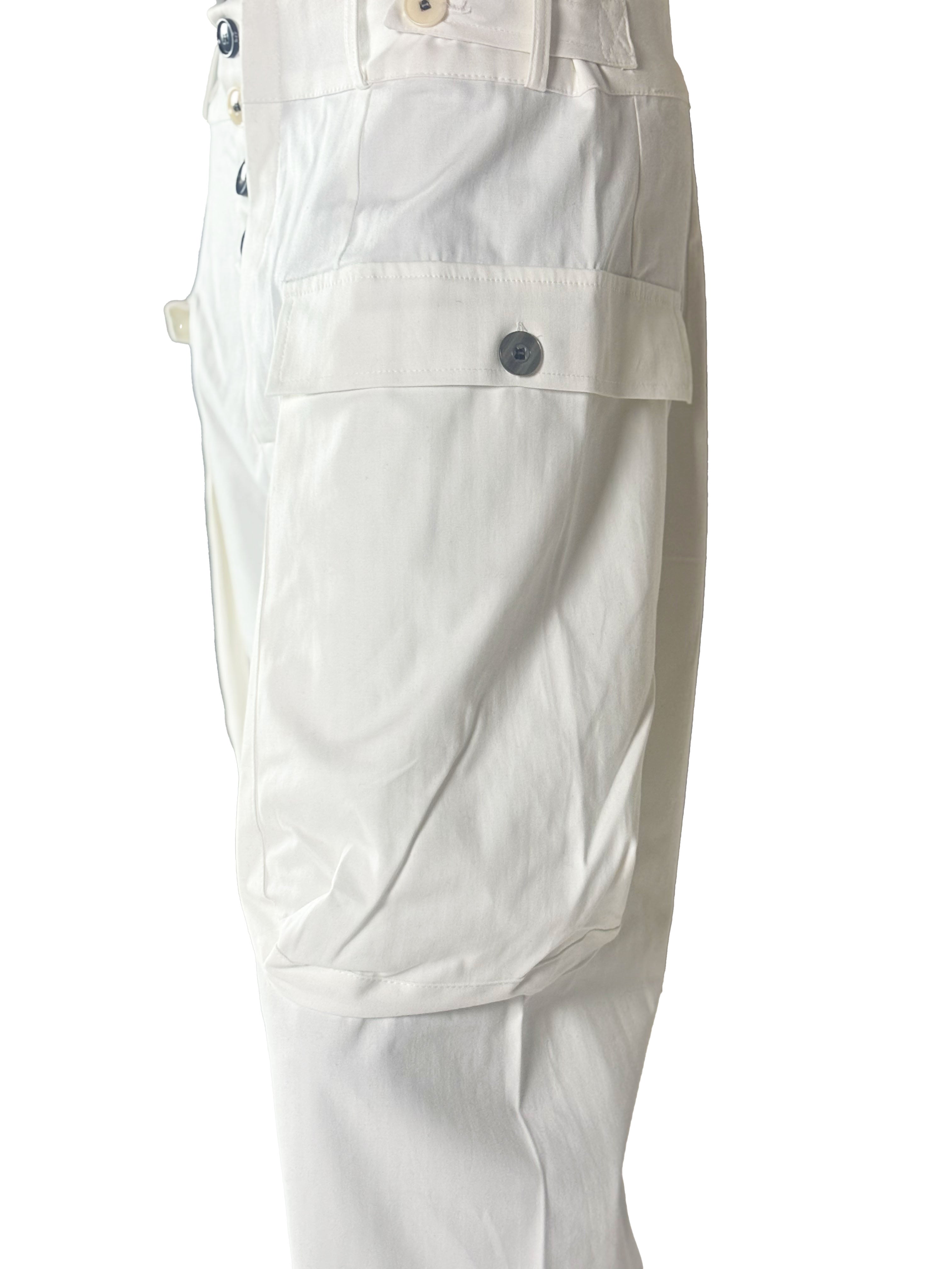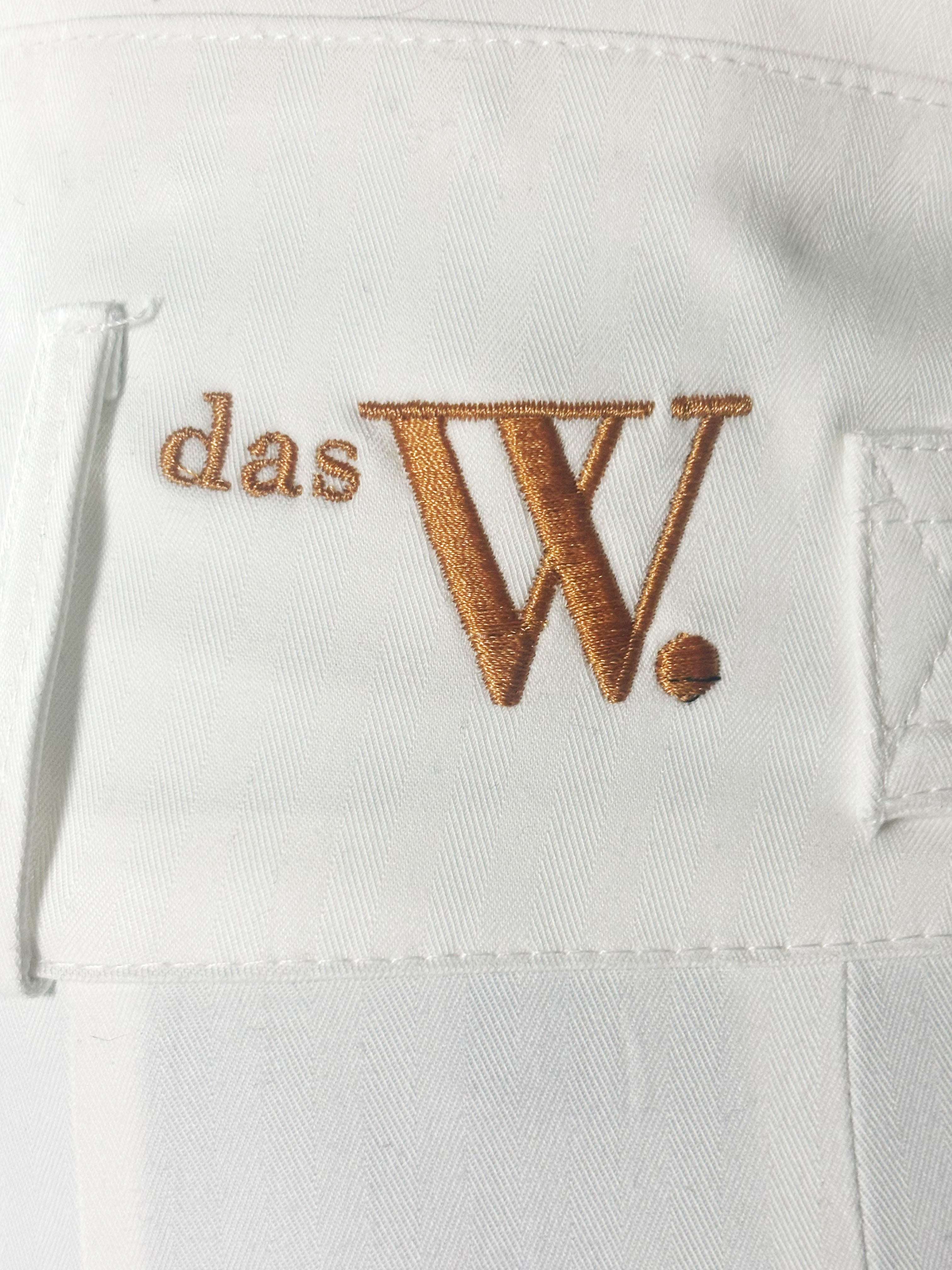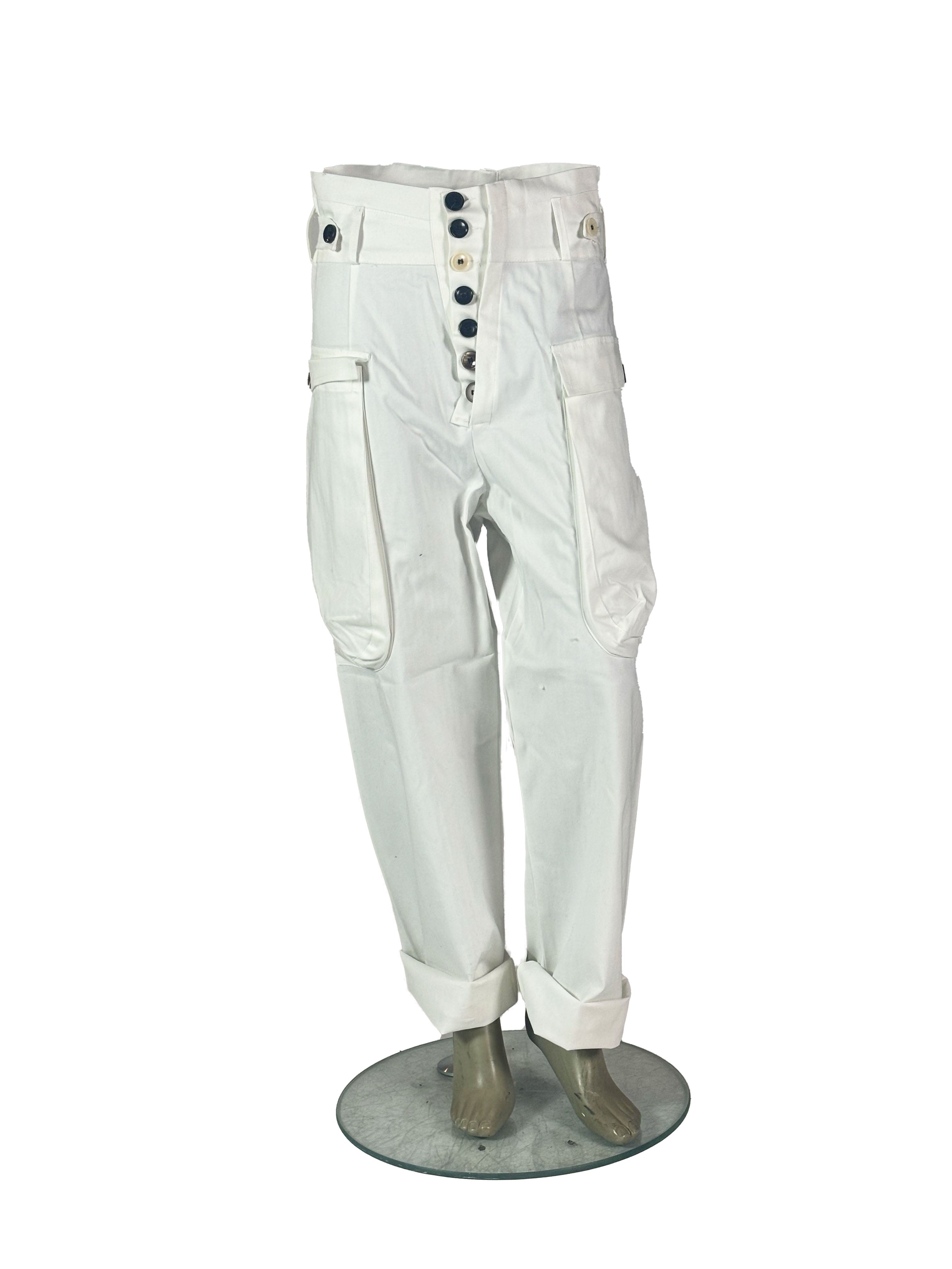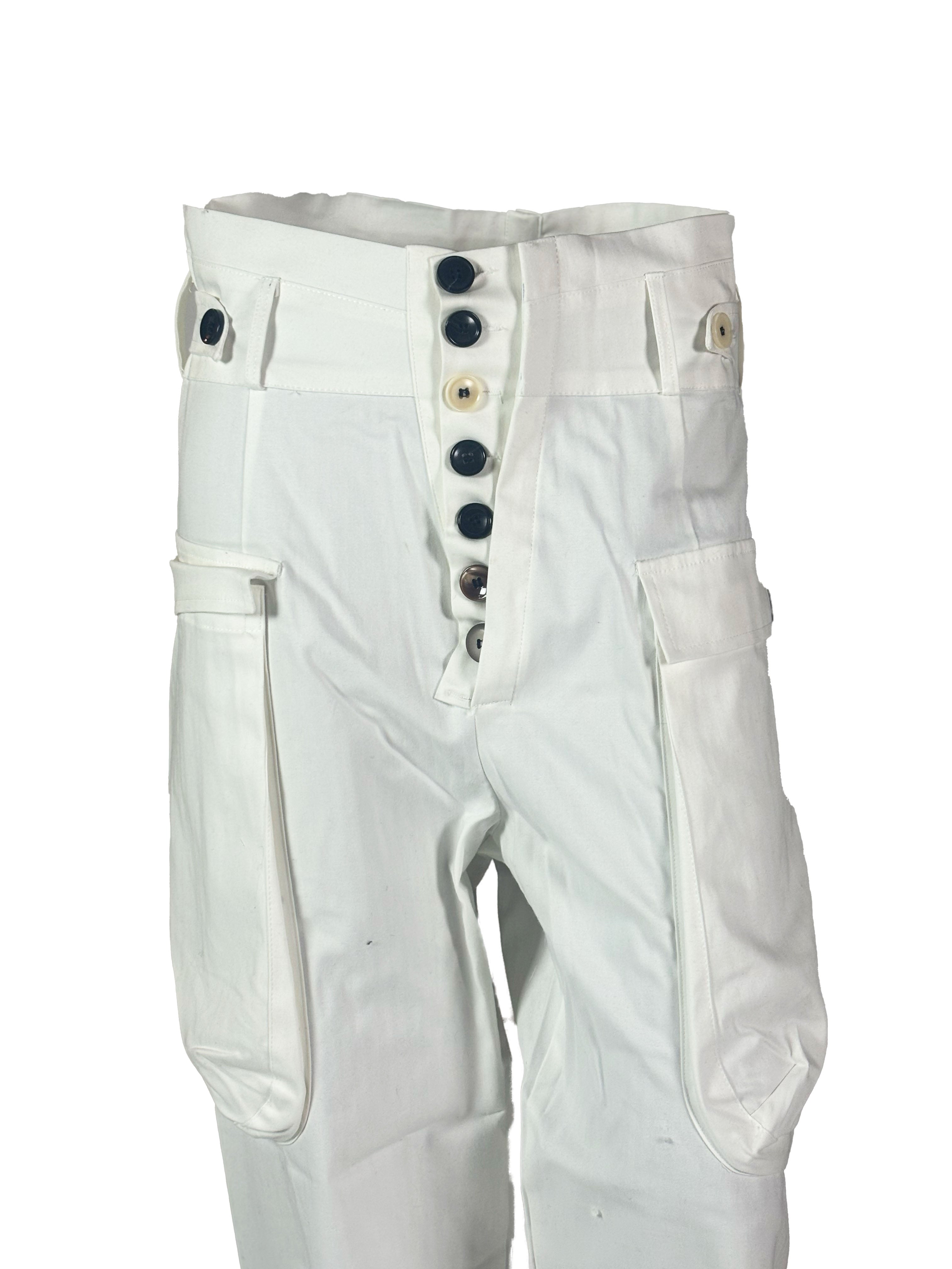 In this white version, the trousers take on a clean and light presence, emphasizing the silhouette with a minimal and almost architectural clarity.
